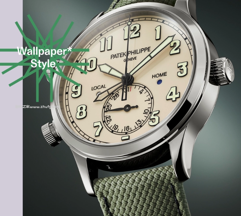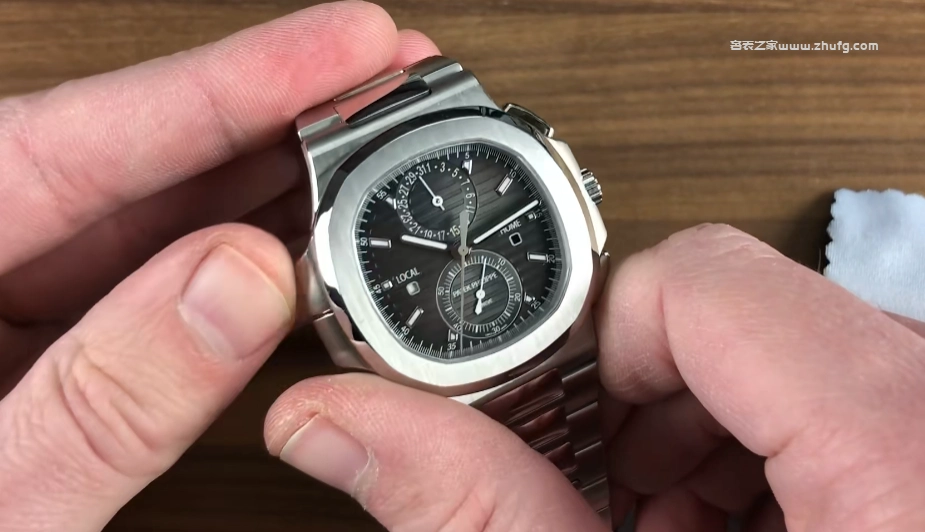 盤面的平衡感做得也非常出色。12點鐘位置有一個日歷盤,下方有一個60分鐘的計時盤,兩邊分別表示本地時間和家裡時間的晝夜指示。可以注意到表殼左側用來設置旅行時間的系統按鍵也被集成到鹦鹉螺的表格設計中,不會顯得違和,基本上還是保持了鹦鹉螺本身那種帶有兩個小翅膀的造型。