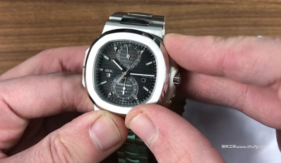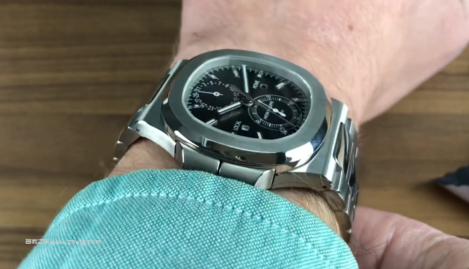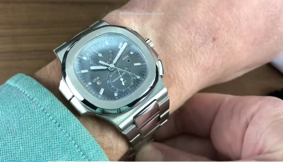 這款表盤使用的是一種漂亮的深灰色,具有拉絲質感,上面帶有橫向排列的條紋,從76年的初代鹦鹉螺就一直在使用。可以看到在表格的右側,它的計時按鈕也被集成到這一側的小翅膀中,並沒有突兀。