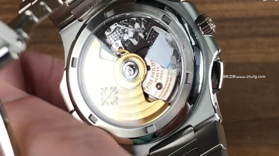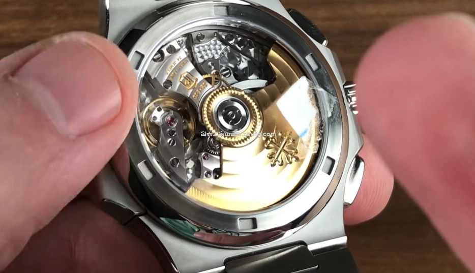 現在再來看一下它的背面,看看它的機芯。這款表搭載的機芯型號是28520,為自動上鏈,配置了垂直離合導柱輪計時,帶有34顆寶石,六位可調。百達翡麗的雙P印記有兩項功能,分別是計時和雙時區,擁有55小時的動力儲備,並且配置了陶瓷擺脫軸承,百達翡麗標誌性的Jo Max風格擺輪,同時也是無卡度的結構,相對來說在避震上會做得更加出色一些。