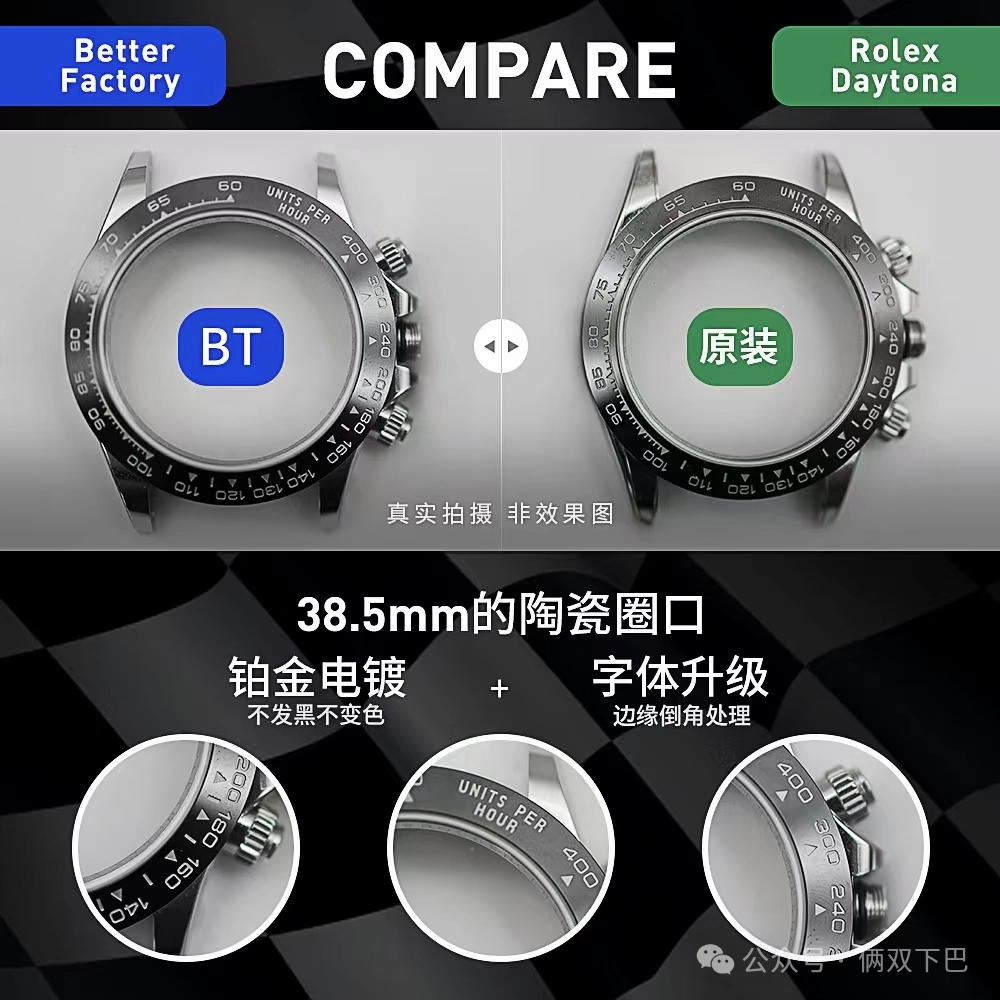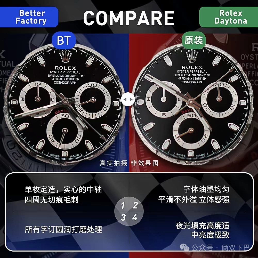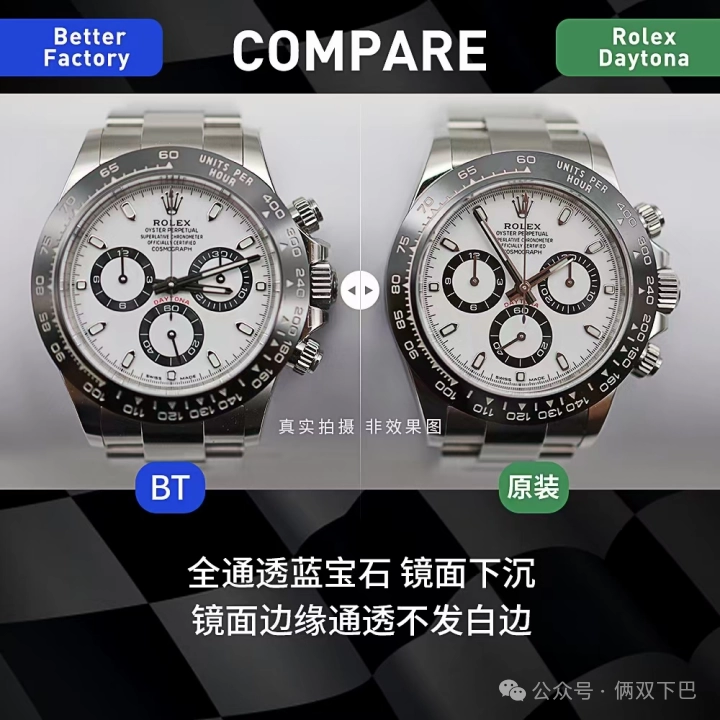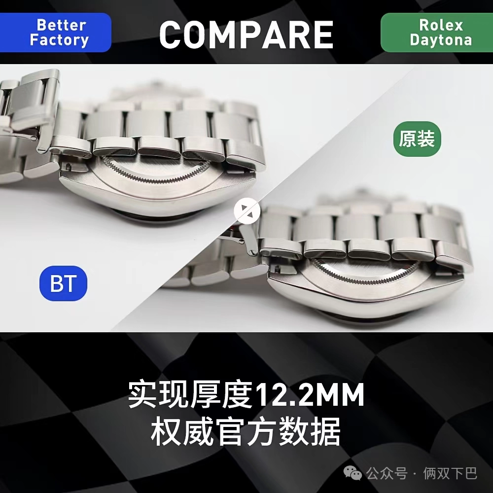 1.BT廠迪通拿4130機芯腕表厚度12.2mm,目前市場最薄的版本,和原版一樣厚度,目前比市場上n廠4130迪通拿和C廠迪通拿都薄,7750迪通拿就不用說了,厚度超過14mm,一眼假。並且4130機芯極其穩定,另外bt廠迪通拿克服c廠盤面發白的缺點,並且鏡面做了下沉。