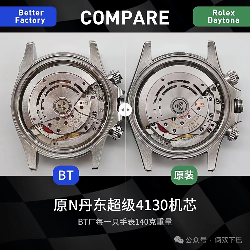 2.採用丹東定制的4130機芯,根據原版結構做的,穩定度極強,幾乎零返修,可以對比上圖,bt廠刻字做的非常好,刻字的顏色以及字體都是一致的,目前4130機芯最好的打磨。