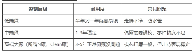 先講實話,復刻表沒有正品那麼耐操,正品能戴十幾二十年不大問題,但復刻再好也很少有人這樣長時間佩戴,因為機芯多數不是原廠自製,而是國產或改良的瑞士機芯,穩定度跟壽命都有限制。不過你要問能不能戴個三到五年,其實沒什麼太大問題,前提是要挑對等級,還有日常保養要做。