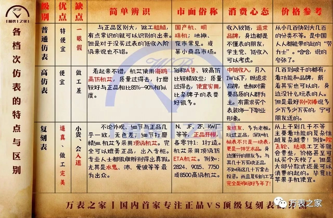 首先,當今社會任何一個行業之所以存在,就是因為它的市場需求。黑格爾的《法哲學原理》中「存在即合理」也正詮釋了這一點。無論做服務行業或是做產品零售業,都有三六九等之分。當然了,復刻表行業也是一樣,同一塊復刻表從做工的精細程度上面劃分,從地攤貨的幾十元到頂級復刻等級的幾千元不等。我相信明智的消費者在為了自己的需求買單時,在挑選產品時絕不只是聚焦於產品的價格。人們的關註點是什麽?試想一下如果我們在挑選一件商品時候,我們是奔著價格去的嗎?不是,我們關註的是性價比,這個商品能給我帶來什麽樣的價值,然後他的做工、成本、質量等等又是個什麽樣的檔次?這樣綜合分析下來,馬上可以得出一個比值,這時候我們再去衡量這個東西他到底值不值。