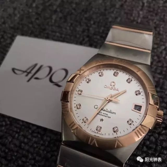 歐米茄星座系列男款間玫金銀面,紳士之選,直徑38毫米,厚度11毫米,改8500自動機械機芯,藍寶石水晶玻璃鏡面,316精鋼材質表殼表鏈,折疊扣,防水30米。
