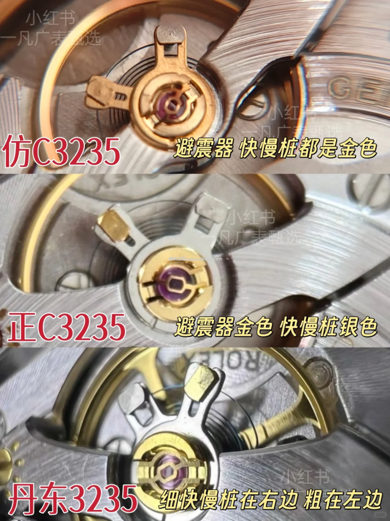 跟原來一樣,只需要看避震器就可以百分百分辨,圖上我列舉了三個最常見的3235機芯,機芯避震器之間都有着明顯的區別都有自己的特徵,但是還有一點要注意的是,看機芯的同時也一定要看編碼,因爲VS廠同樣也是丹東3235機芯,VS廠和C廠的編碼是不同的,一定要注意區分。