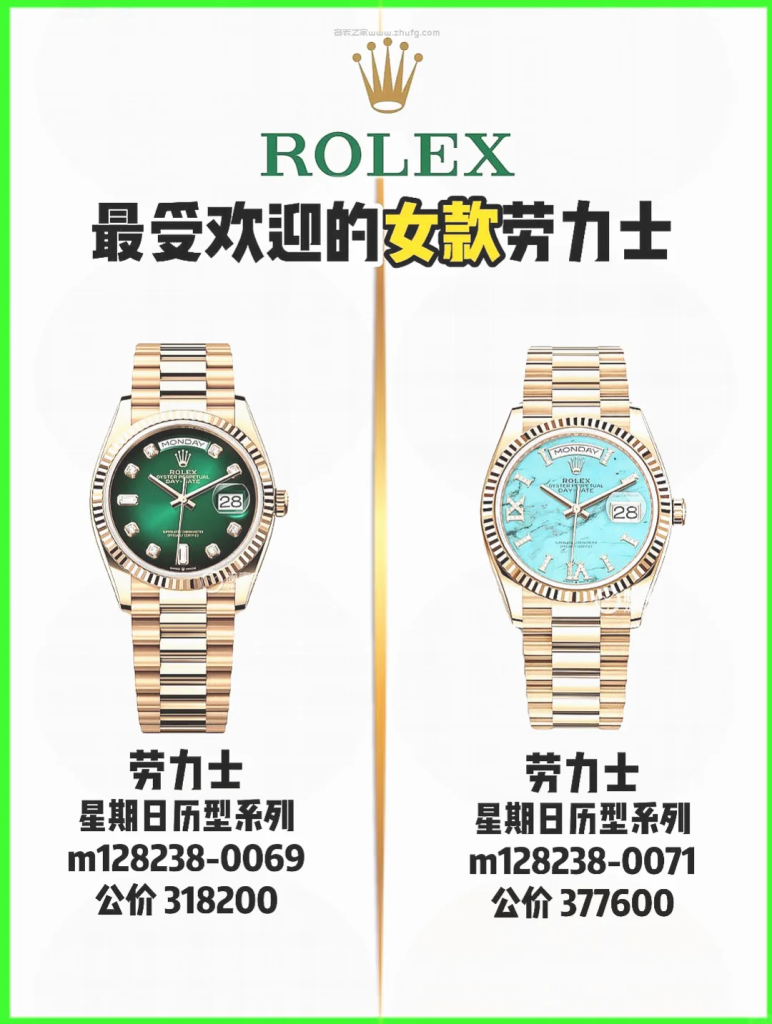 想進階收藏、追求尊貴感的,星期日曆型(Day-Date)系列是最高等級選擇,全金材質如 m128238-0069 綠面或 m128238-0071 冰藍面,公價分別為 $318,200 和 $377,600,這種級別已經是屬於貴婦級別配置,戴得起這系列,身份地位不言而喻。