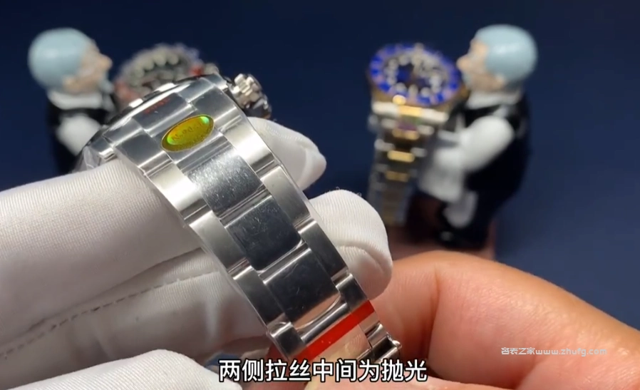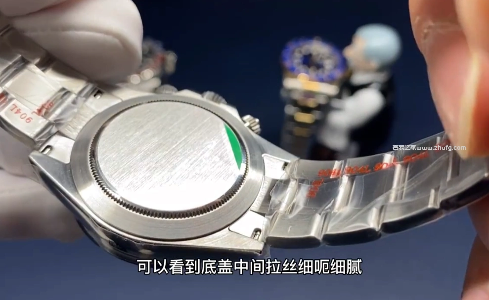 表帶採用了904金剛材質,並且使用了勞力士經典的雙排鏈設計。兩側拉絲,中間為拋光,整個表帶完全遵循原裝工藝,經典的蚝式表扣。打開表扣,裡面激光雕刻也非常清晰,同時可以微調,與原裝一致。底蓋為密底設計,底蓋中間的拉絲處理非常細緻,整體做工也非常不錯。