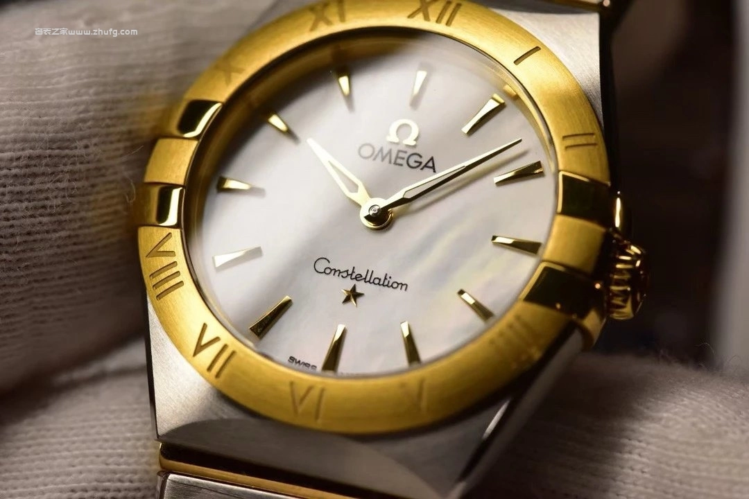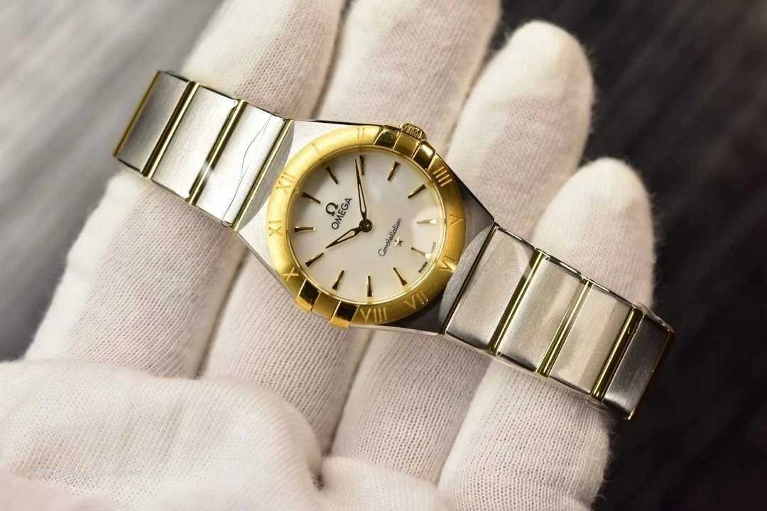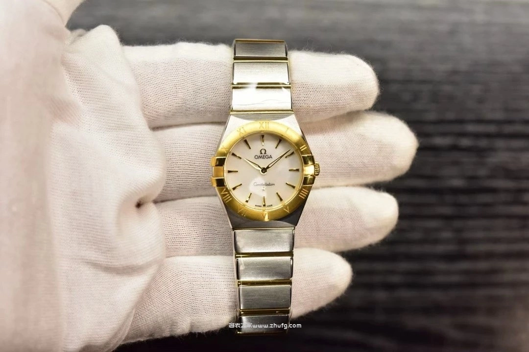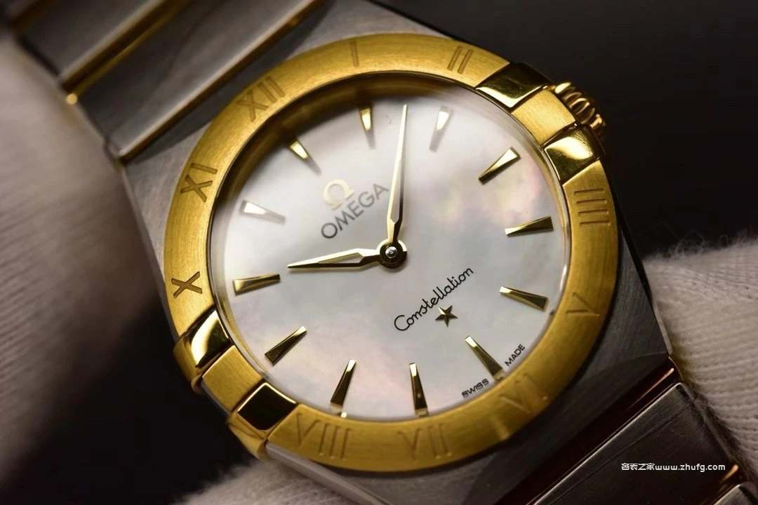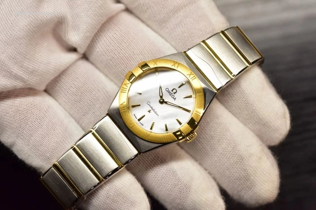 歐米茄星座系列女錶,以經典「爪式」設計結合現代優雅風格。錶殼為精鋼與18K黃金間金搭配,貝母錶盤柔和高貴,金色指針與時標閃耀細膩光澤。內置瑞士石英機芯,走時精準穩定。28毫米尺寸佩戴輕盈細緻,適合日常與正式場合。整體設計展現歐米茄星座系列的永恆魅力與女性柔美氣質。