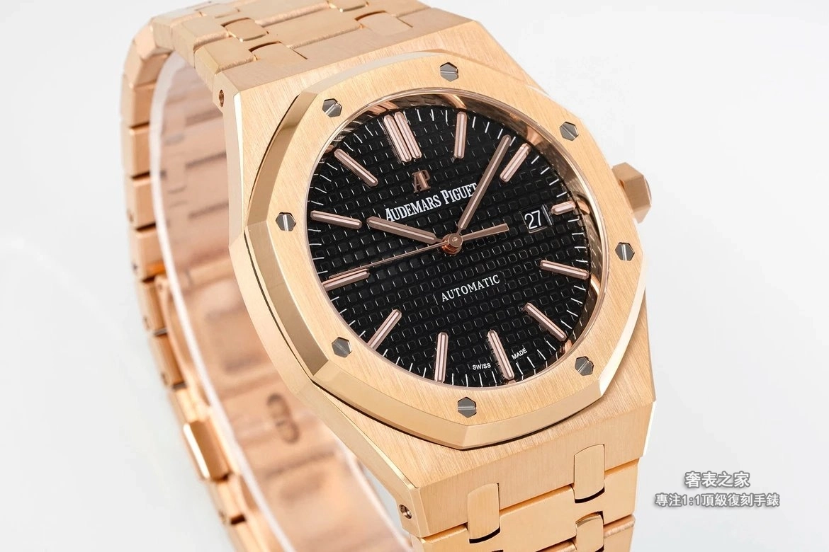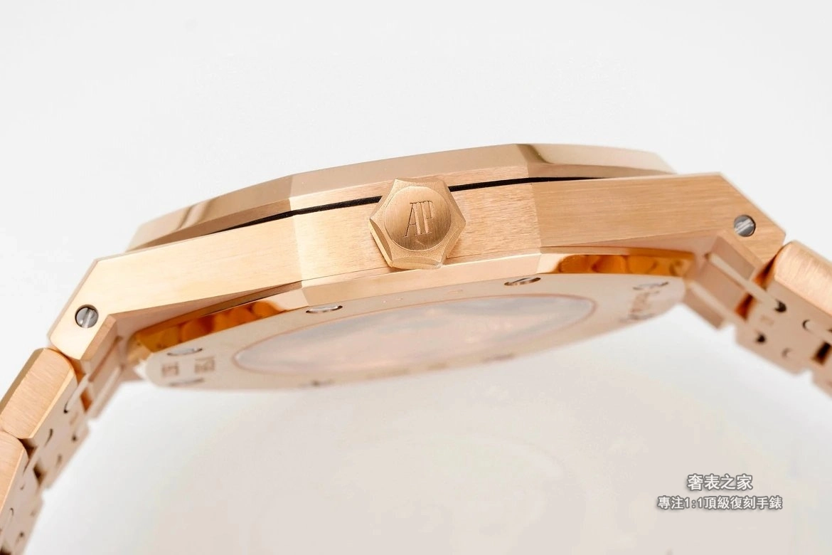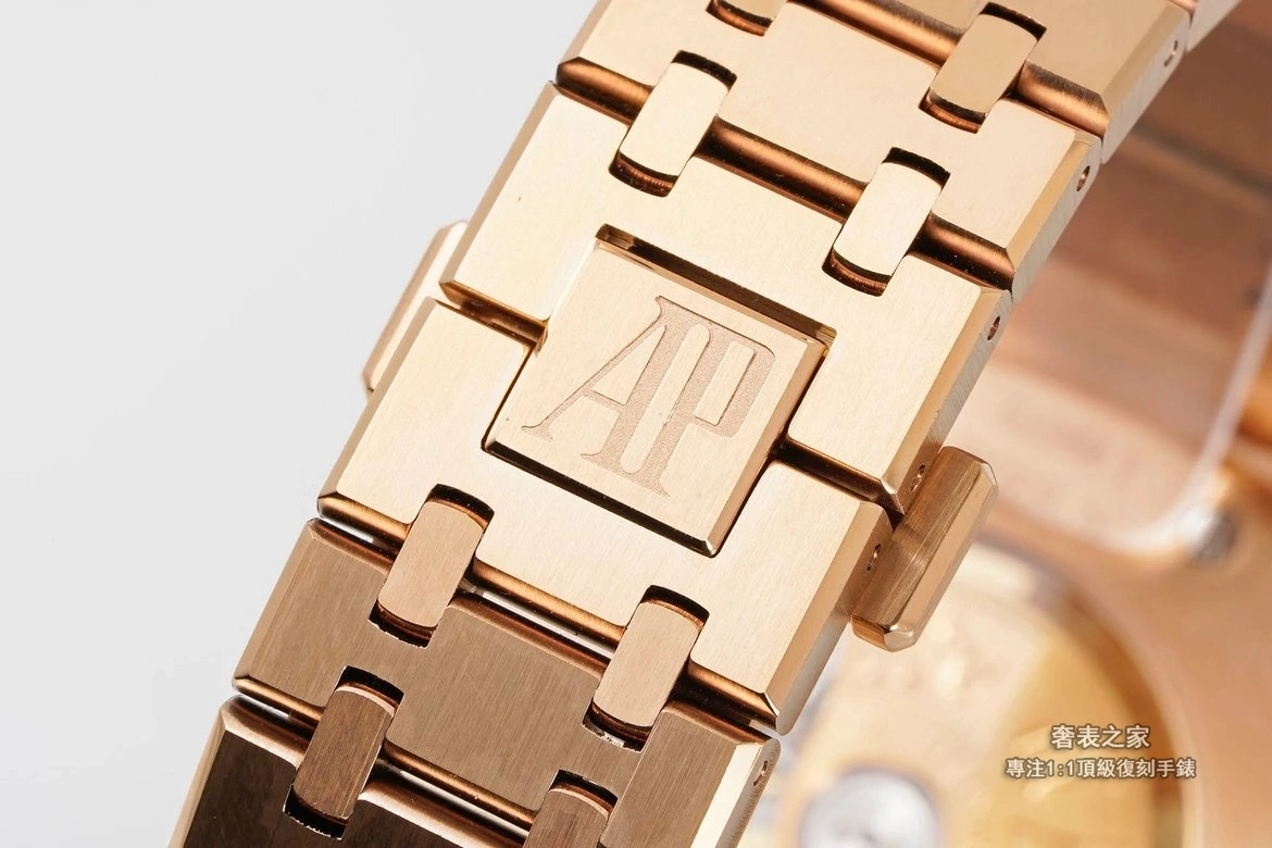 錶殼與錶帶採用細膩直線拉絲工藝,邊角處理圓潤不刮手,完整呈現皇家橡樹標誌性的金屬質感。活動式錶帶頭粒結構、錶扣開合手感與雕刻細節,均對齊正品規格。