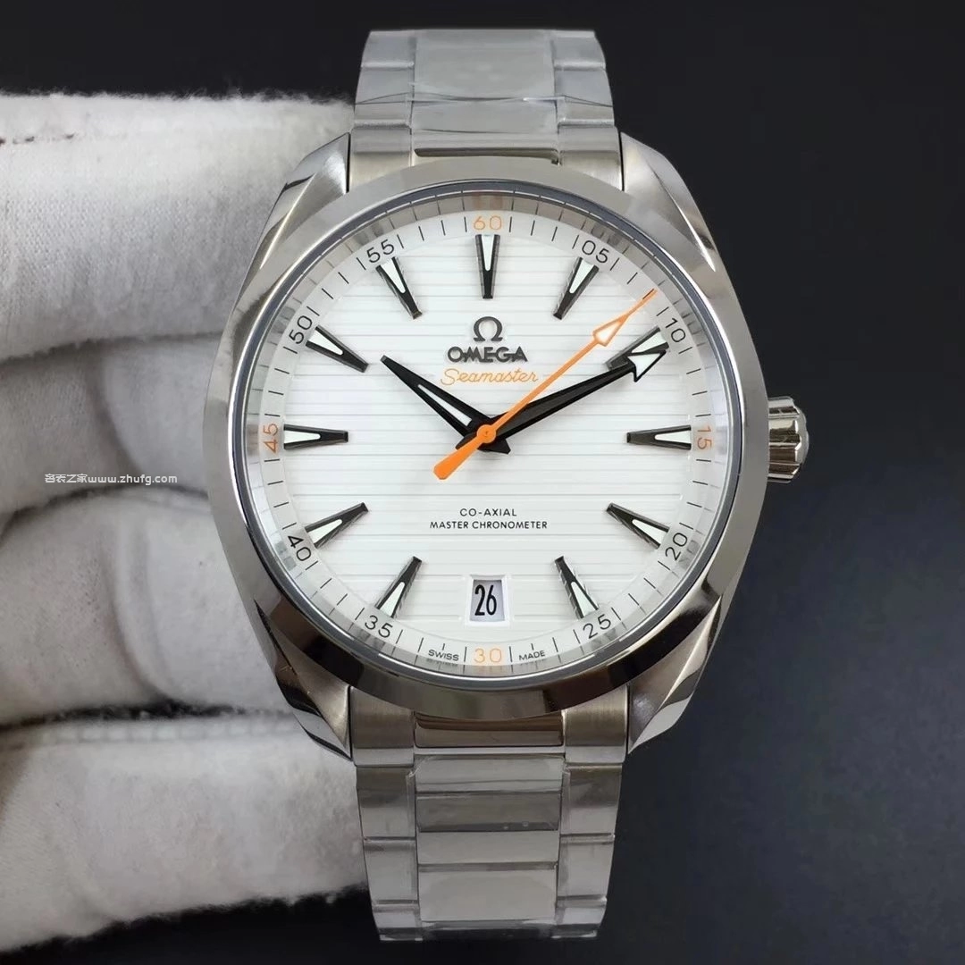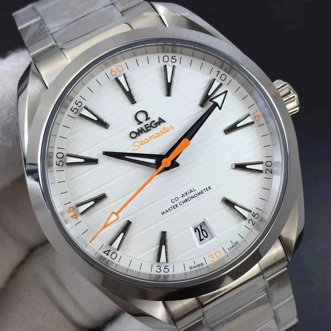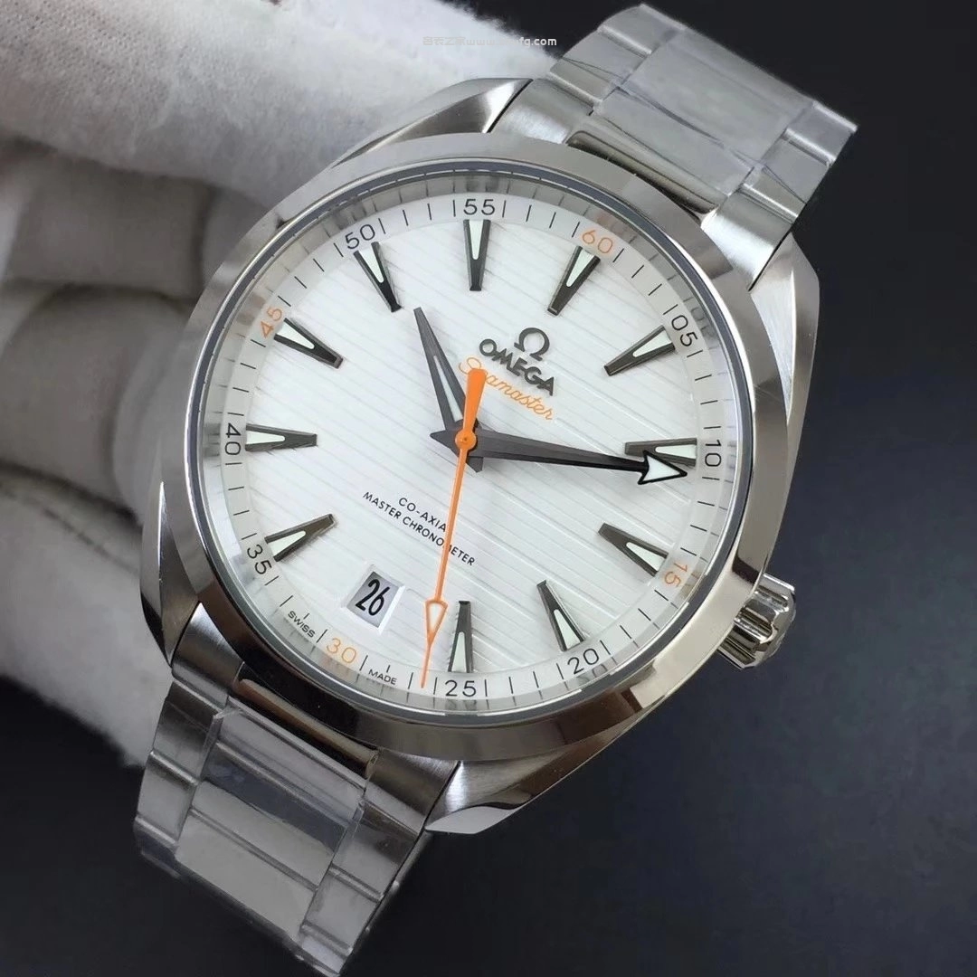 VS廠出品的歐米茄海馬 Aqua Terra 150米白面橙針款,搭載8900同軸自動機芯,還原正品水平柚木紋理錶盤與細膩拋光拉絲工藝。橙色秒針與分鐘刻度極具辨識度,搭配41毫米不鏽鋼錶殼與鋼鏈錶帶,整體質感精緻。玻璃採用藍寶石鏡面,底蓋透視設計,防水深度達150米,是一款兼具運動與商務風格的高品質復刻腕錶。