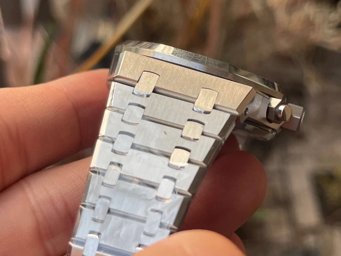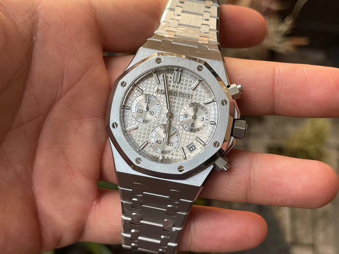 此款愛彼皇家橡樹系列計時碼錶26240ST,採用41mm精鋼錶殼與白色Tapisserie格紋錶盤,配置飛返計時功能與藍寶石玻璃鏡面。搭載仿CAL.4401自動計時一體機芯,厚度與原裝一致,按鈕回彈感與計時啟動手感均達高水準,展現機械美學與頂尖工藝。整體重量感與精鋼質感極具原裝風範,是市面上極罕見對版度極高的超級復刻版本。