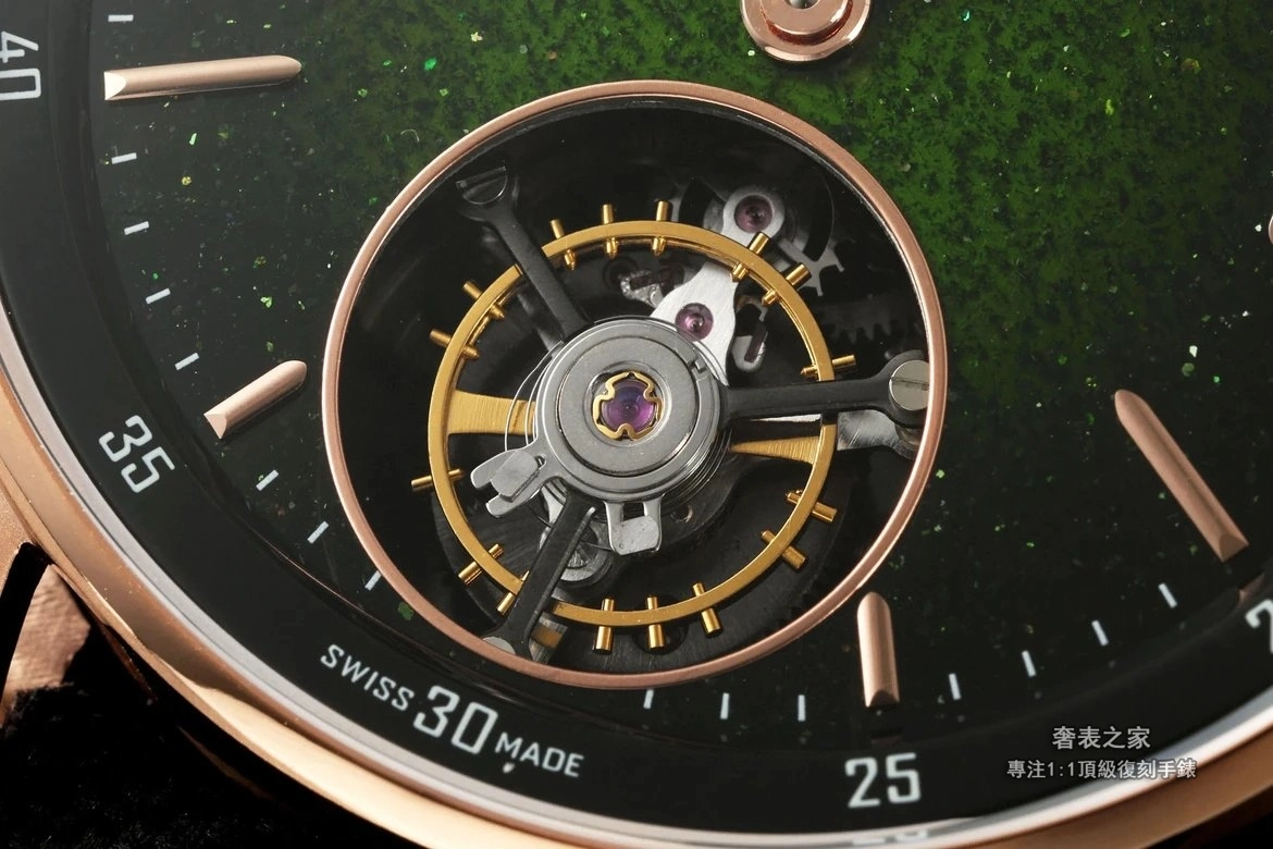 飛行陀飛輪結構設於 6 點鐘位置,立體感強烈,運轉狀態清晰可見,整體視覺效果兼具藝術性與高級製錶魅力。