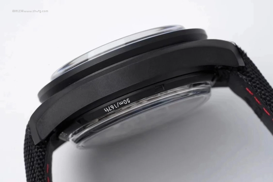 錶殼採用黑色氧化鋯陶瓷材質,直徑 44.25mm,質感沉穩大氣;配備 雙面防反光藍寶石水晶鏡面,展現出高透亮度。計時按把與摺疊扣均為陶瓷製成,耐磨抗刮。