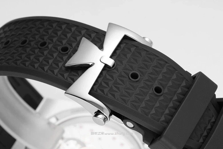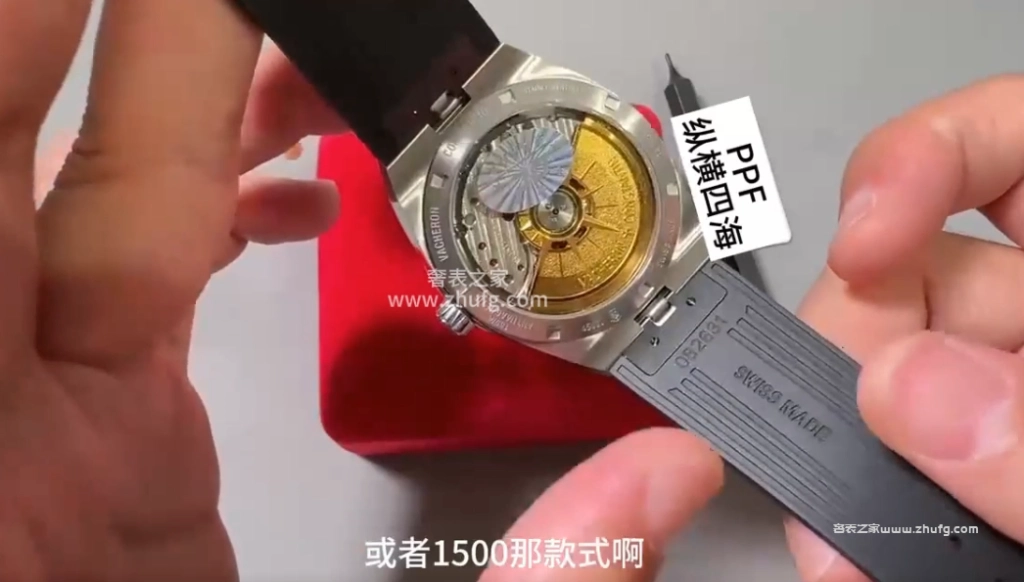 這是快拆膠帶,表扣也是快拆,質感相當不錯。機芯搭配的是 9015 機芯夾板仿原裝 51007。因為這款相對不算特別熱門,所以一直沒有做開模機芯,但這款夾板機芯做得還是有模有樣,穩定性肯定沒問題。9015 本身的穩定性要比 15400、1500 那些開模機還要穩定。如果追求開模機芯,可考慮鸚鵡螺或者 1500 款式。若喜歡這個款式,這個機芯戴上手也看不出差異。