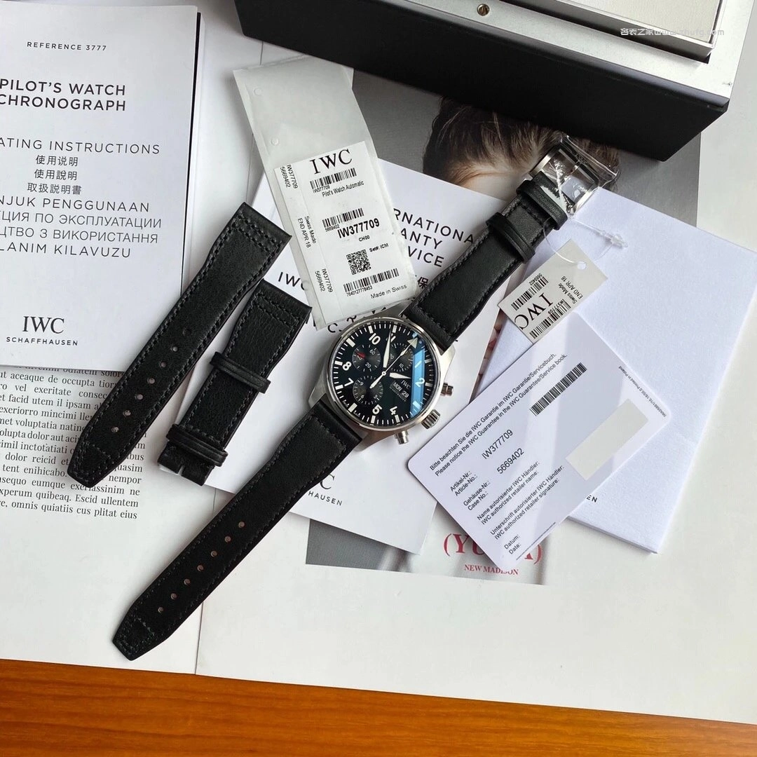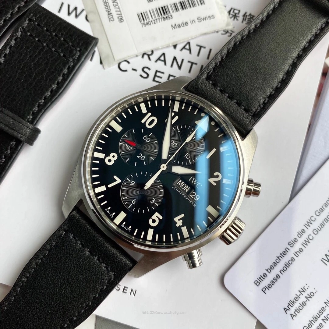 這款萬國飛行員計時腕錶採用經典黑色錶盤設計,六針計時佈局清晰易讀,搭載原裝瑞士 ETA7750 自動機芯(又稱 79320 機芯),穩定可靠。配備防眩目藍寶石玻璃鏡面與 43mm 正裝錶徑,佩戴質感沉穩大氣。