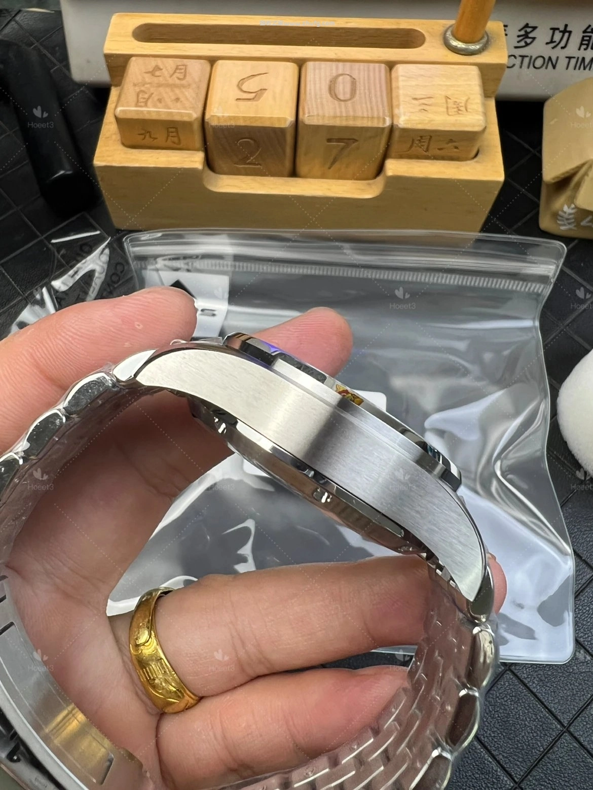 有一些個別地方的打磨不是特別好,大家也可以自己去磨磨。像這種地方,但一般正常佩戴上手的話,是碰不到這些地方的。這是藍面,同樣也有這個快拆鋼帶。再說一下鋼帶,它也是快拆的。看到了嗎?隔著鏡頭,這拆起來不方便,大家拆的時候把它往里扣就行了。還有表帶,這也是快拆的,這個表帶的成本還是挺高的。