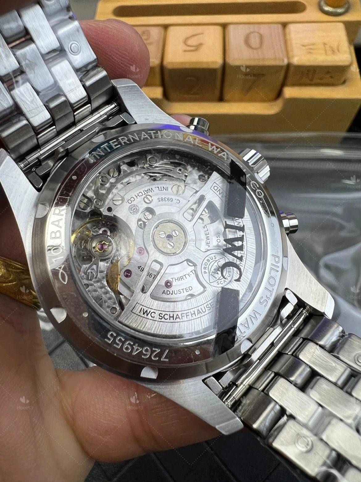 咱們再來看一下這款機芯,這款機芯我已經對照這個原裝機芯看過了,它的板路完全對的,應該是全 凱蒙 的機芯。不過我沒有詳細拆解,我估計大概率是真正開機機芯,找一張原裝圖片給大家看一下。這是原裝的圖片,大家也可以仔細對比一下。看到嗎?不管是螺絲的位置,包括這些寶石的位置,再加上小的 logo 刻字,做的完全對,幾乎沒什麼破綻,相當不錯。