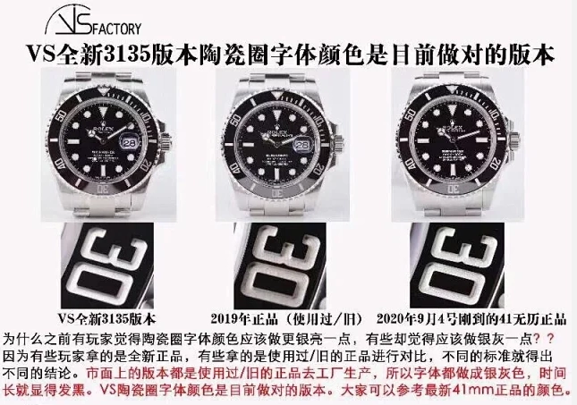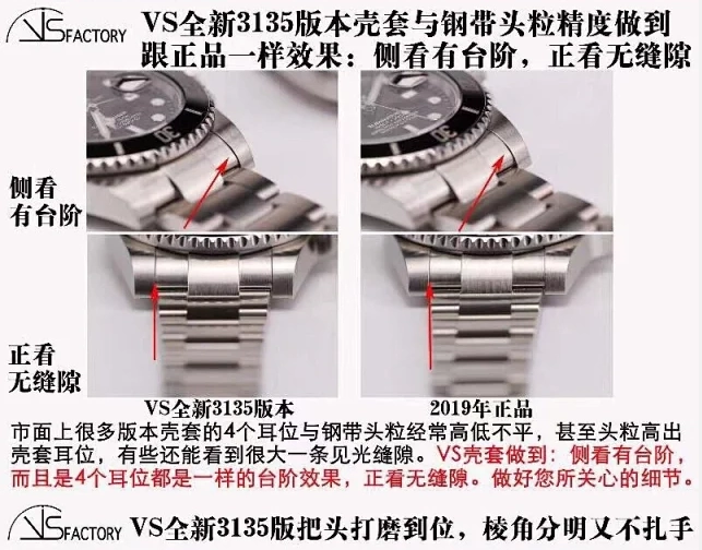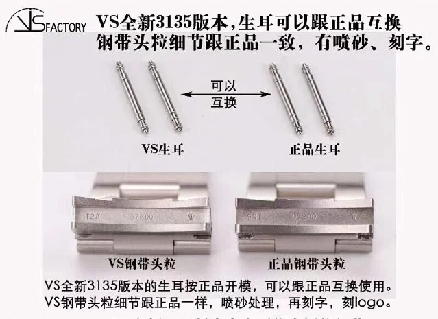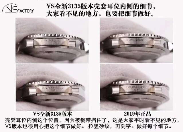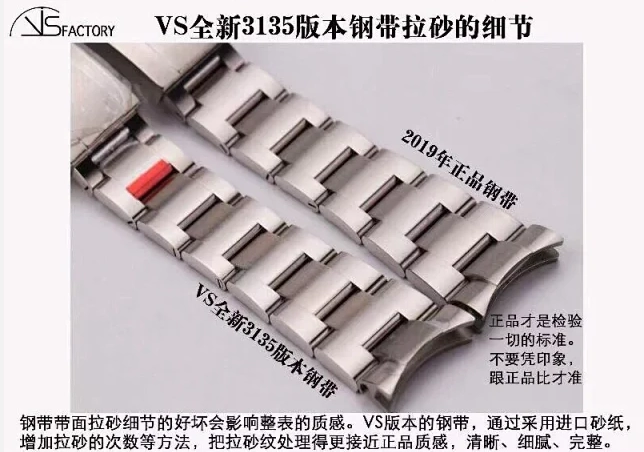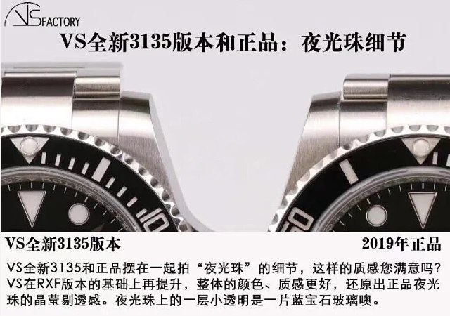 在細節方面,VS廠勞力士40毫米款手表的刻度、夜明珠、日歷窗口等都非常精致。刻度的長度和寬窄程度與原裝完全一致,夜明珠的色澤和凸起高度也做得非常到位。日歷窗口的大小和日歷數字的形態、顏色都與原裝一致,旋轉手感也非常接近原裝‌12。