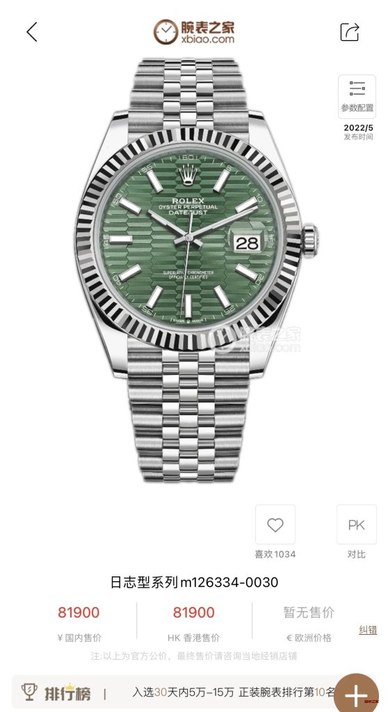 VS廠勞力士41MM日誌型系列m126334-0030 (水波紋綠盤)腕表