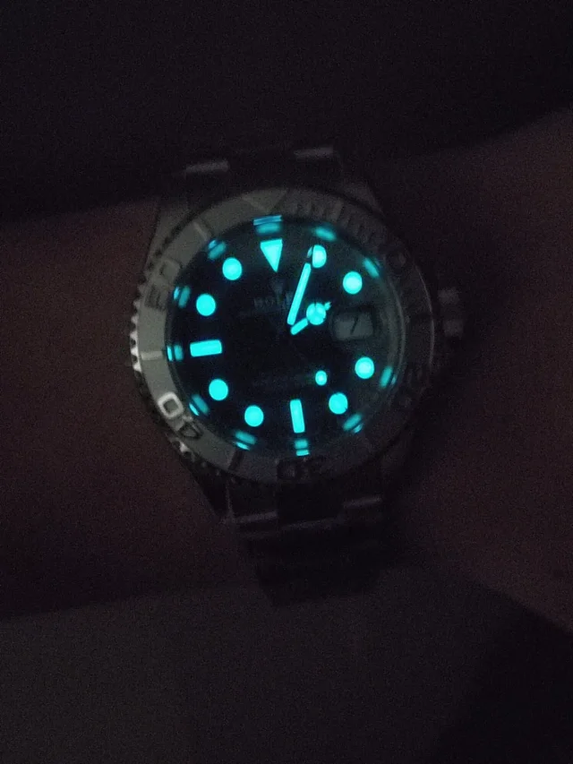 3.右側藍色面,c廠相較於真品而言,藍色略淺一些,當然了,放射紋盤面的特點就是在 不同的光線下呈現出的顏色不一樣,準確說,RGB色值在一個基準上,整體就不會有太 大的偏差。因為c廠在整個放射紋表盤上,例如水鬼盤,各種日誌盤,以及本次遊艇盤, 涉及到彩色放射紋的,均采用同真品一致的pvd電鍍工藝,優點就是 保證出貨顏色不會 因為批次不同,而色調上產生差異化。另外就是鍍層薄,能夠清晰看到底面的太陽紋路。 但是就是成本高。