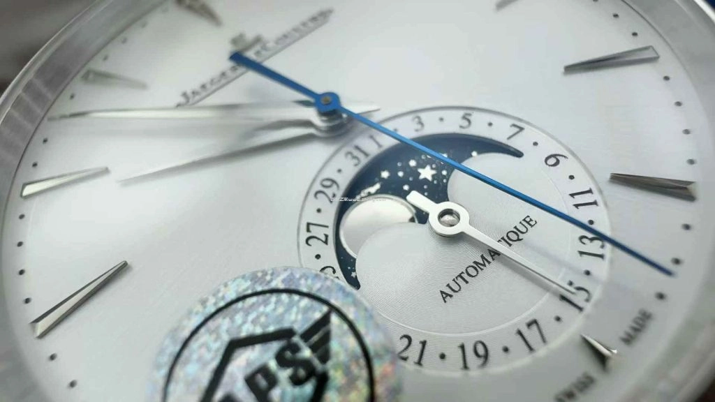 原本最擔心的是月相盤會不會太假,但實際看起來星空藍色層次很自然,而且秒針藍鋼效果也蠻漂亮。整體盤面對稱度很好,是很典型積家正裝表設計風格。