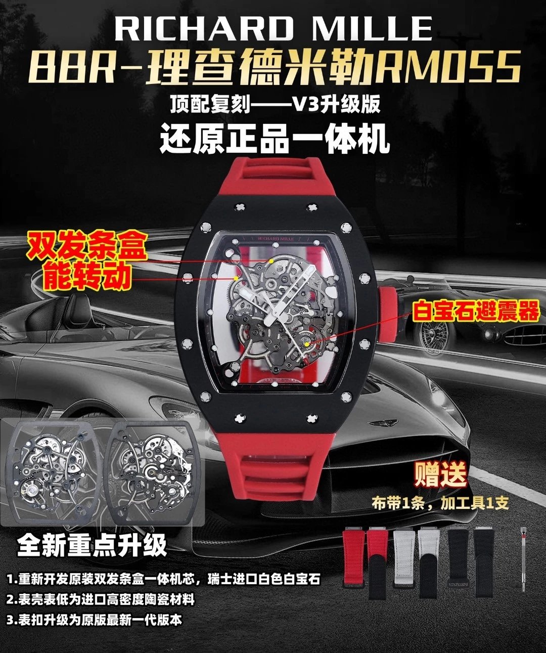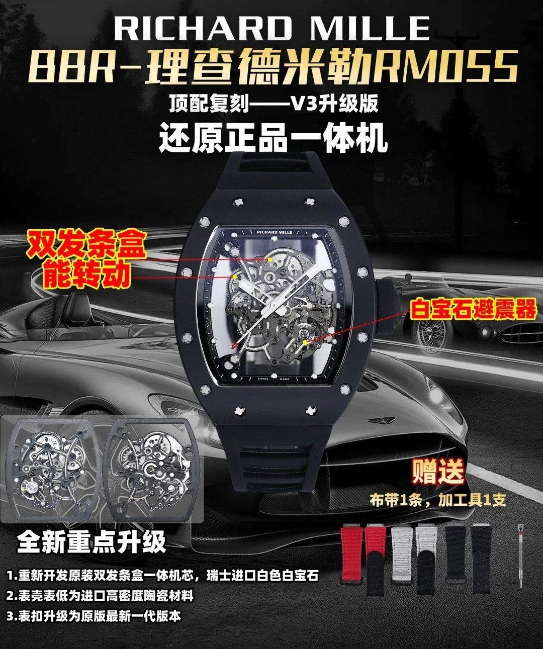 2⃣️機芯:重新開發原裝RMUL2一體機芯,雙發條盒機芯擺輪清晰可見會動。告別一眼假的夾板機芯!