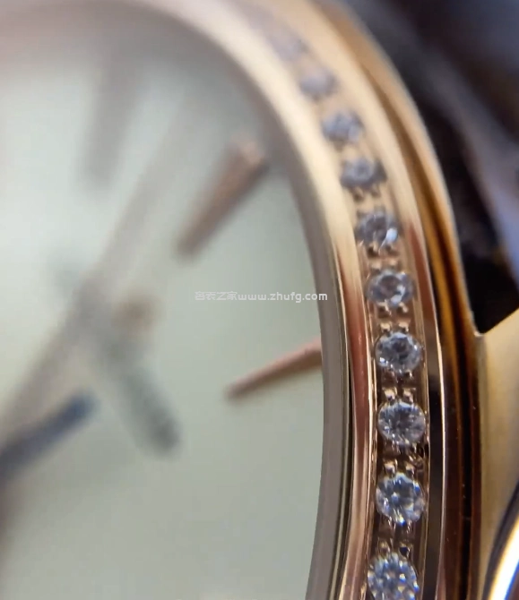 錶圈方面我們看一下,可以很直白地看到鑽圈的一個款式,莫桑鑽的材質,每一顆的間距都有做到位,非常分明,也非常閃。特別是在白天太陽光照射下,呈現出的火彩都是非常亮眼的。