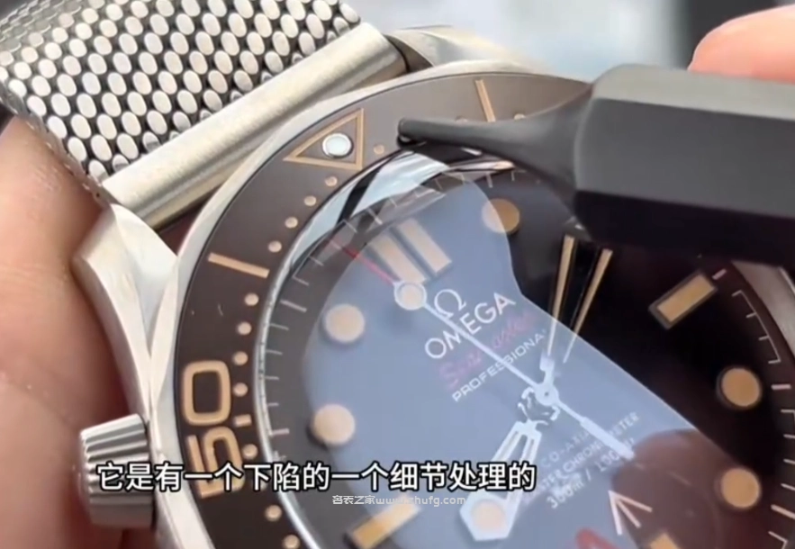 再來看一下錶盤,錶盤採用了鈦金屬材質,搭配鋁製圈口。圈口夜光粉的填充色澤與原版一致。市面上一些小廠夜光粉填充顏色偏差明顯,而 VS 這款 007 是目前市面上唯一能做到整體細節全面對版的版本。
